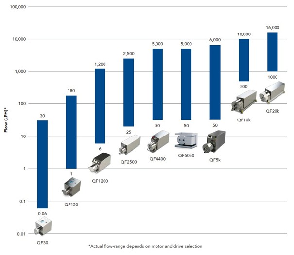 Met verschillende pompmaten in zowel single- als multiple-use dekt het complete Quattroflow-pompassortiment een stroomcapaciteit tussen 0,06 en 16.000 L/u. Daarmee heeft Hitma voor iedere toepassing de juiste Quattroflow-pomp. Zie hieronder voor een indicatie van de flow rates van de diverse pompen.